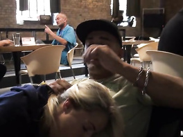 Some young guy brought his blonde beauty girlfriend to restaurant and naughtily kissing at front of people around them. This naughty couple is going completely shameless and blonde slut gets down on sucking guy’s cock before licks her cunt and hotly fucks her
