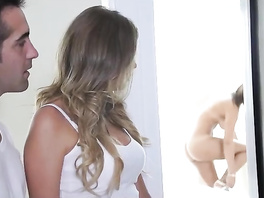 Handsome fucker and beautiful blonde chick spied sexy young babe undressing in her room and getting on the bed nude to masturbate her puss. Couple joined that chick and pleased with cunnilingus, fucked her with strapon and made to suck guy’s cock and ride it