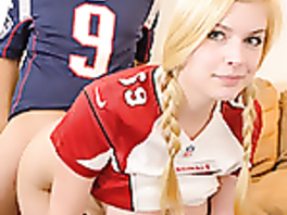 Handsome young fucker guy is sitting on couch with wide spread legs bare ass and his wonderful blonde girlfriend is standing on her knees on the floor and doing tight deep blowjob to him until cock gets hard and then gets her nipples sucked and pussy hotly fucked in doggy pose