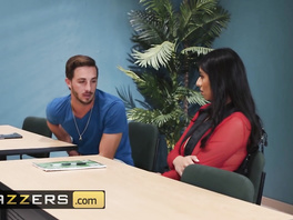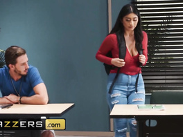 Young brunette girl with beautiful bubble butt and big swinging boobs is seducing her teacher by showing tits and then doing deepthroat blowjob until big dick erecting hard riding hard cock with shaved pussy in cowgirl position on the desk in classroom